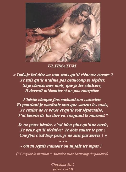 » ULTIMATUM « Accueil › Vos poèmes ***UN SEUL PAR JOUR*** Les « poèmes » érotiques descriptifs ne sont pas les bienvenus... Ce sujet contient 3 réponses, 4 participants et a été mis à jour pour la dernière fois par Sybilla, le 24-07-2025 16:05. Créateur Sujet 24 juillet 2025 à 16h05 #2721440 Mascotte d'Oasis christian Sujet: 6554Réponses: 13392 Christian RAY avec Michel Drucker et Patrice Laffont Créateur Sujet Vous lisez 2 fils de discussion Auteur Réponses 24 juillet 2025 à 7h14 #3576752 Fran?ois Sujet: 300Réponses: 49951 Bonjour Chris, très beau poème teinté d’humour Amitiés La po?sie, c'est comme la cuisine, le mot faitout 00063312-1 24 juillet 2025 à 8h02 #3576768 Mascotte d'Oasis Noel-Opan Sujet: 1825Réponses: 9624 Heureusement qu’elle n’ a pas dit repassage ..mais bien repas sage… 24 juillet 2025 à 16h05 #3576809 SybillaMaître des clés Sujet: 5464Réponses: 79667 Bonjour Cher Ami poète Christian, « La patience est mère de sûreté » Enfin, je l’espère pour elle ! Superbe et plein d’humour ! Belle journée Cher Ami poète Christian ! Toutes mes amitiés Sybilla Le r?ve est le poumon de ma vie (Citation de Sybilla) Auteur Réponses Vous lisez 2 fils de discussion Vous devez être connecté pour répondre à ce sujet. Connexion Identifiant: Mot de passe: Rester connecté Connexion Log in / Register