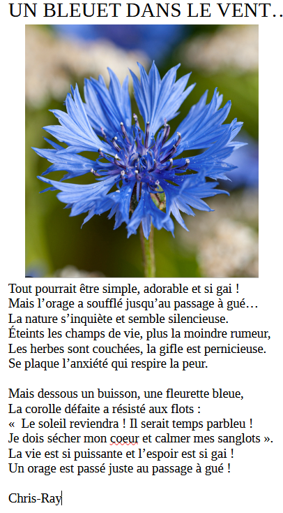 Très joli poème en 2 parties, où on est triste d’apprendre que notre Bleuet est dans tourmente..et où on partage l’espoir !