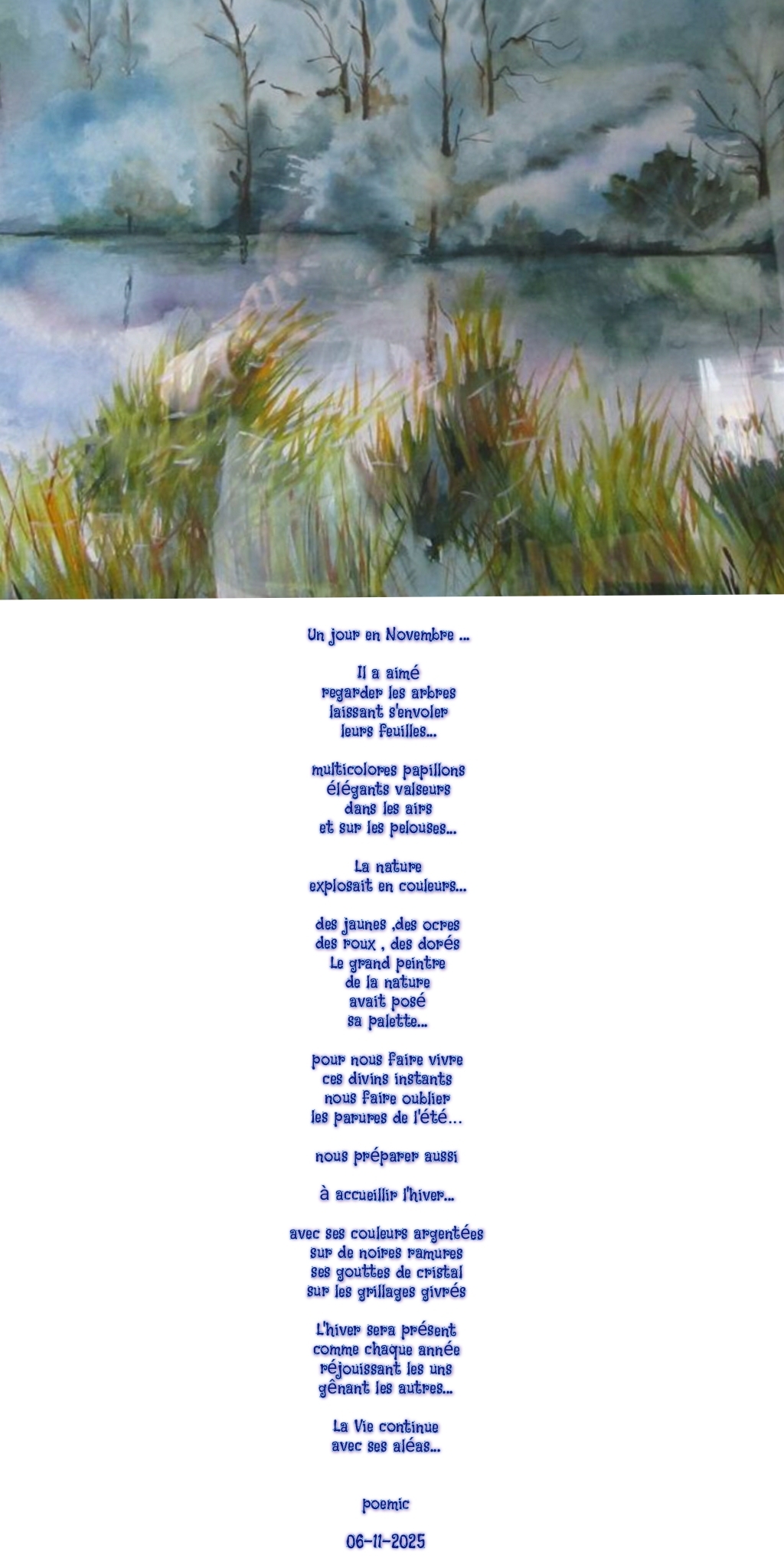 Un magnifique poème qui ressemble à un tableau lorsque vous dépeignez la nature automnale en utilisant une riche palette de couleurs. Votre description de l’hiver qui s’approche est plus sobre mais pleine de délicatesse