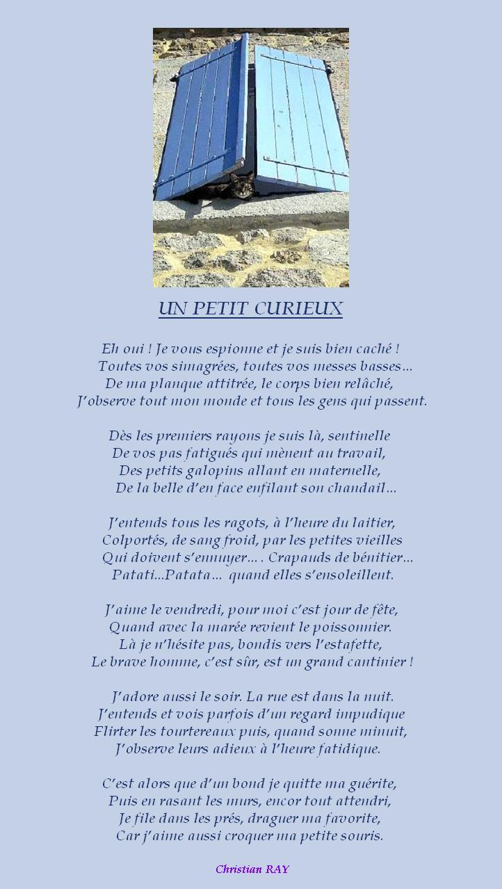 » UN PETIT CURIEUX « Accueil › Vos poèmes ***UN SEUL PAR JOUR*** Les « poèmes » érotiques descriptifs ne sont pas les bienvenus... Ce sujet contient 3 réponses, 4 participants et a été mis à jour pour la dernière fois par Sybilla, le 11-01 21:48. Vous lisez 3 fils de discussion Auteur Messages 10 janvier 2026 à 19h48 #3600219 Fran?ois Sujet: 300Réponses: 49951 Bonsoir Chris, très beau poème, une caméra de surveillance sur pattes joliment poétisé Amitiés La po?sie, c'est comme la cuisine, le mot faitout 00063312-1 11 janvier 2026 à 7h41 #3600233 Mascotte d'Oasis Noel-Opan Sujet: 1825Réponses: 9624 Les vieilles bigotes trouvent ce chat pelé…qui va au ras des murs le soir pour croquer la souris… Un humour distillé avec précision 11 janvier 2026 à 21h48 #2724906 Mascotte d'Oasis christian Sujet: 6554Réponses: 13392 Christian RAY avec Michel Drucker et Patrice Laffont 11 janvier 2026 à 21h48 #3600269 SybillaMaître des clés Sujet: 5464Réponses: 79667 Bonsoir Cher Ami poète Christian, Oh le coquin qui guette la souris ! Superbe poésie humoristique ! Bonne Année 2026 ! Belle soirée Cher Ami poète Christian ! Toutes mes amitiés Sybilla Le r?ve est le poumon de ma vie (Citation de Sybilla) Auteur Messages Vous lisez 3 fils de discussion Vous devez être connecté pour répondre à ce sujet. Connexion Identifiant: Mot de passe: Rester connecté Connexion Log in / Register