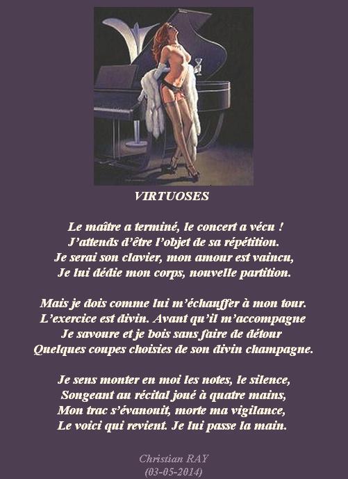 » VIRTUOSES « Accueil › Vos poèmes ***UN SEUL PAR JOUR*** Les « poèmes » érotiques descriptifs ne sont pas les bienvenus... Ce sujet contient 4 réponses, 5 participants et a été mis à jour pour la dernière fois par Sybilla, le 23-06-2025 16:17. Créateur Sujet 23 juin 2025 à 16h17 #2720931 Mascotte d'Oasis christian Sujet: 6554Réponses: 13392 Christian RAY avec Michel Drucker et Patrice Laffont Créateur Sujet Vous lisez 3 fils de discussion Auteur Réponses 23 juin 2025 à 12h41 #3573797 Thierry jeangneau Sujet: 551Réponses: 3509 Très joli Bravo 23 juin 2025 à 12h59 #3573803 Mascotte d'Oasis TIZI MOHAMED Sujet: 1702Réponses: 25075 un clavecin fin prêt, pour le toucher https://www.edilivre.com/peregrinations-29f53ef39f.html/ https://www.edilivre.com/le-spleen-de-la-logique-de-l-absurde-2c490d0b23.html/ 23 juin 2025 à 16h12 #3573823 Fran?ois Sujet: 300Réponses: 49951 Bonsoir Chris, très belle coquinerie poétique Amitiés La po?sie, c'est comme la cuisine, le mot faitout 00063312-1 23 juin 2025 à 16h17 #3573827 SybillaMaître des clés Sujet: 5464Réponses: 79667 Bonjour Cher Ami poète Christian, Toujours des poésies pour nous faire éclater de rire ! Belle journée Cher Ami poète Christian ! Toutes mes amitiés Sybilla Le r?ve est le poumon de ma vie (Citation de Sybilla) Auteur Réponses Vous lisez 3 fils de discussion Vous devez être connecté pour répondre à ce sujet. Connexion Identifiant: Mot de passe: Rester connecté Connexion Log in / Register